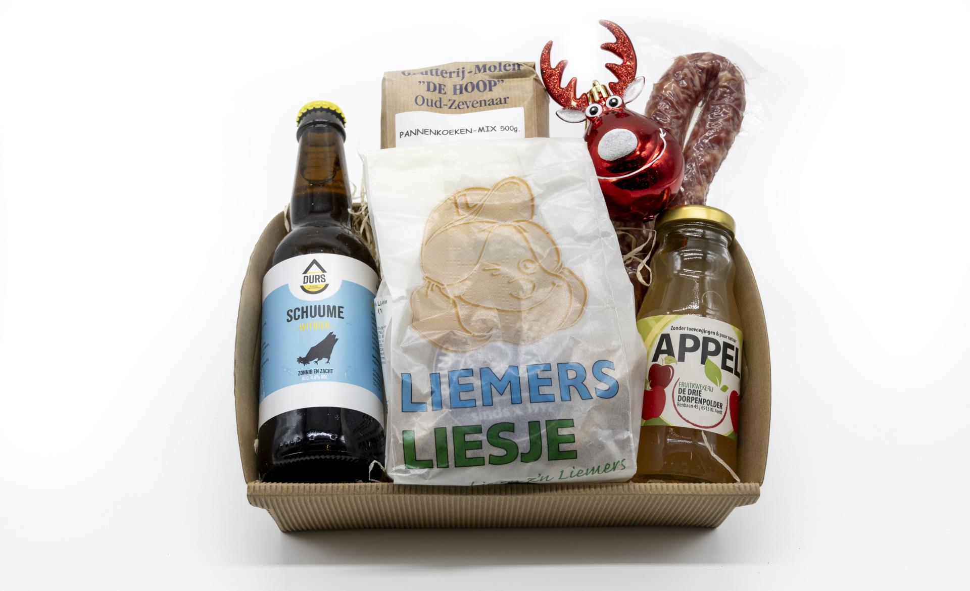 Verras je dierbaren met ons sfeervolle kerstpakket "Lokale Kerst", gevuld met heerlijke producten uit de buurt en mooi verpakt. Geniet van een verfrissend lokaal biertje, heerlijke Liemerse liesjes, en smaakvolle GroenRijk metworst. Maak samen pannenkoeken met de bijgeleverde pannenkoekenmix van Molen De Hoop en een verkwikkend glas appelsap van De Driedorpenpolder. Perfect voor een gezellige, lokaal moment tijdens de feestdagen!