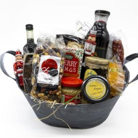 Verras iemand met dit unieke kerstpakket, prachtig verpakt in een zinken teil! Geniet van een selectie van heerlijke producten, zoals de feestelijke Merry X-mas thee, Doesburgsche mosterd, en een flesje Merlot. Dit pakket bevat ook een stukje kaas, noten unimix, dipsticks, en een smaakvolle kaasdipper van vijgen en dadels.